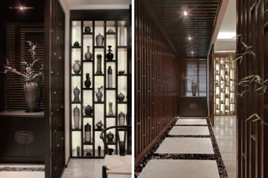 這是一間專為修心養(yǎng)性及收藏會友所量身定做的私人場所??臻g以傳達輕松、舒適、放松的氛圍為目的。推門而入,“綠竹入幽徑,青蘿拂行衣”,這全靠兩旁的木質(zhì)格柵營造氛圍。這個木質(zhì)格柵的設(shè)計靈感來源于竹子,借用竹節(jié)的形式,設(shè)計了這種木質(zhì)格柵的樣式。腳底的踏石加上青嫩的竹葉,帶給人一種自然親切、平靜放松的感覺,悠閑、隨意的生活意境盡顯眼底,濃郁的東方禪意氣息隨之而來。