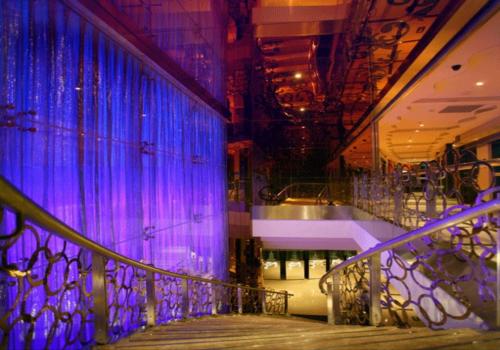 挑空區(qū)不同大小的玫瑰金鏡面不銹鋼圓環(huán)扶手,層層疊疊,醉醉醒醒,在加上旁邊的藍(lán)色玻璃幕墻,達(dá)到一種很強(qiáng)的藝術(shù)效果。