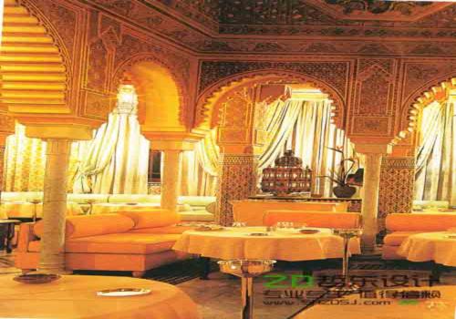 該咖啡廳設(shè)計(jì)室內(nèi)用伊斯蘭式的拱券欄廊來(lái)分隔不同的就餐空間,圓柱輕巧纖秀,