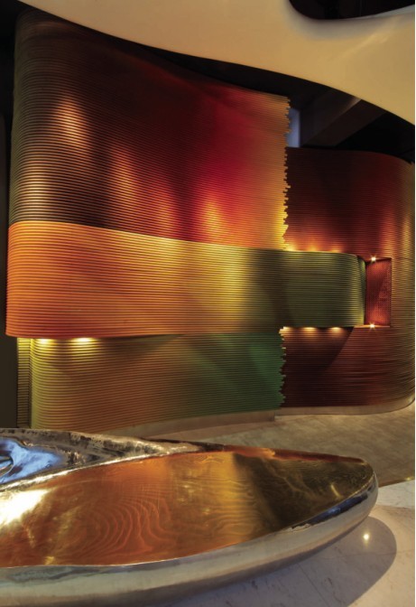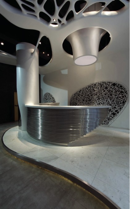 從某種程度上講,不銹鋼轉(zhuǎn)化了異形椅在通常經(jīng)驗(yàn)下的物質(zhì)內(nèi)涵,它更多的從功能向形式上做了一次大膽突破。而軟雕墻則采用了PVC塑料管外纏尼龍線再刷丙烯涂料的方法,使得整個(gè)空間在視覺上得到更加愉悅的刺激。室內(nèi)也大膽保留了原建筑部分墻體與新構(gòu)筑的藝術(shù)形態(tài)形成新舊反差。同時(shí)也更加突出了雕塑般的流體結(jié)構(gòu)。整個(gè)水療會(huì)所空間完全沒有老建筑改造的跡象,最終的藝術(shù)效果得到大家的一致認(rèn)可。