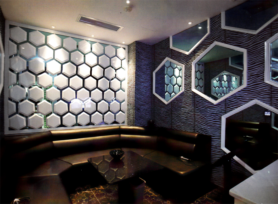在選材上,以環(huán)保為宗旨,基本選擇常規(guī)材料,地面以拋光磚為王,墻面是成品烤漆板人造石與鏡面玻璃的組臺,頂面天花軟膜、石膏板,用最簡單的材料組臺表現(xiàn)出豐富有層次的藝木效果。這個KTV設計呈現(xiàn)出多樣性和三富性的新形態(tài),更多體現(xiàn)出年輕群體的時尚速度、健康與活力。