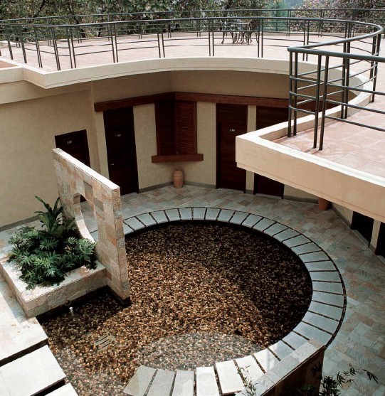 商務(wù)會(huì)所設(shè)計(jì)采用“少即是多”的演繹手法,用最少的“語言”表達(dá)閑逸與寧靜。一樓出內(nèi)亭過道,麻石小地臺(tái)泰柚木方柱棗紅色的陶罐與竹竿組臺(tái),在簡(jiǎn)約的過道空間中起到了點(diǎn)綴作用一樓與二樓的過道是一個(gè)內(nèi)亭園,清澈的小水池、麻石小臺(tái)階圓形的門洞配以嶺南芭蕉,人置其中,倍感幽雅怡情。過道與內(nèi)亭園的“曲徑通幽”以及大堂的“簡(jiǎn)約空靈”形成了對(duì)比夕陽的余暉輕撫著山林的樹梢,樹梢的柔弱顯出建筑的陽剛之美。