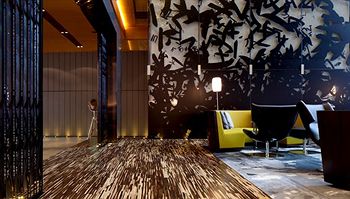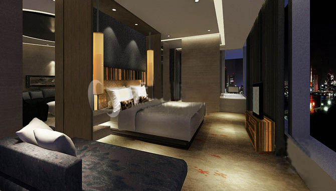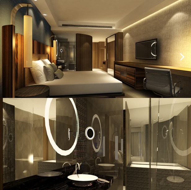同時這些木質家具、樓梯也從材質和色彩上平衡了酒店公共空間中被大量使用到的大理石、玻璃、鋼筋等。就連客房中也大量使用了曲線元素,如弧形的浴室門。
