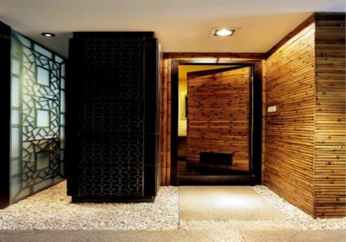 二樓因?yàn)橛写罅康幕⌒瓮ǖ?,設(shè)計(jì)師運(yùn)用了大量的竹片拼貼于墻體更加能從這些竹片上看到古代的純樸高尚。地面配以啞光面的灰色地磚,工字的貼法淋漓盡致地表達(dá)了中式風(fēng)格。自然的氣息與外面鋼筋水泥的建筑形成了對(duì)比,讓整天奔波在外的人能在這里放松身心,享受足底按摩給予的輕松快樂。