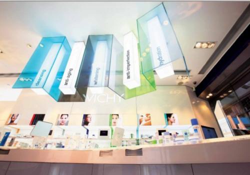 該空間設(shè)計(jì),從地板上的個(gè)噴泉的烏賽克藝術(shù)品開始,這個(gè)馬賽克藝術(shù)品的主要成分是維希產(chǎn)品,接著便是個(gè)置于商店中間的測(cè)試桿,每個(gè)產(chǎn)品系列被發(fā)亮的懸掛在假天花板上的著色玻璃簡(jiǎn)單分割。然而,墻壁顯示器,也整齊地呈現(xiàn)出系列區(qū)別產(chǎn)品系列的彩色條紋。