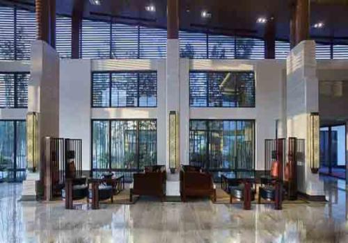 當?shù)氐?ldquo;團云”、“奇木”、“秀水”等自然景觀被設計師以抽象的形式剝離,并運用不同的處理手法自然沁透于酒店不同的室內(nèi)外空間,形成空間內(nèi)外的相應成趣與陰陽和諧。“云”“木”“水”既體現(xiàn)于各個庭院的設計中,同時亦是客房、餐飲及溫泉三部分室內(nèi)空間的設計主題,而標準客房的設計也由此通過色彩、細節(jié)等的處理于統(tǒng)一中形成變化,予人不同的心理感受。源自于當?shù)貍鹘y(tǒng)手工編織布藝--“壯錦”的圖案,則以各種方式表達于墻面、隔斷、家具、布藝等室內(nèi)空間的各個部分。結(jié)合建筑及室內(nèi)的建造中采用的大量當?shù)氐牟牧虾蜖I造方式,以溫和細膩的手法,表達了設計師對當?shù)貍鹘y(tǒng)文化的尊重,同時也帶給客人以充滿本土氣息的、舒適自然的休閑體驗和自然情趣。