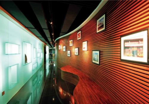 居中結(jié)構墻體強化儲藏及展示功能,內(nèi)藏光源的毛玻璃造型可擺放各種物件, 側(cè)與多功能區(qū)隔斷蜿蜒而成“文化長廊”,遙遙相對。