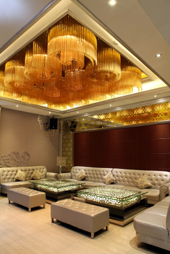 只見(jiàn)那光滑明亮的地磚映著燈光,仿佛指明燈;觸手可及的金色花紋與金屬框架的結(jié)合,仿佛精心裝裱的壁畫;包房里星點(diǎn)般的燈光,仿若星河閃爍;夜場(chǎng)設(shè)計(jì)的大堂和走道里銀色的主題墻在燈光、地板、天花的反射下熠熠生輝,仿佛流動(dòng)的水幕墻,讓人不自覺(jué)地駐足聆聽(tīng)水的聲音。驚奇和欣喜就在這里。